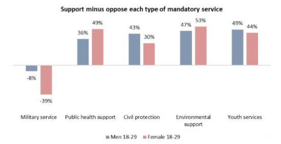 安格斯·里德的調查發現,強制性服兵役似乎更受男性的青睞,尤其是老年男性。支持這一想法的最大群體是60歲以上的男性,占39%;而同一年齡段的女性只有2%支持。18-29歲男性對強制性服兵役的支持率為負,所有年齡段的女性也同樣如此。