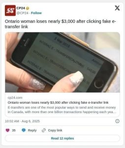 電子轉賬(E-transfer)已成為加拿大最受歡迎的支付方式之一,每年交易量超過十億筆。然而,詐騙分子也不斷“進化”,利用偽造的銀行鏈接釣魚詐騙用戶,令人防不勝防。