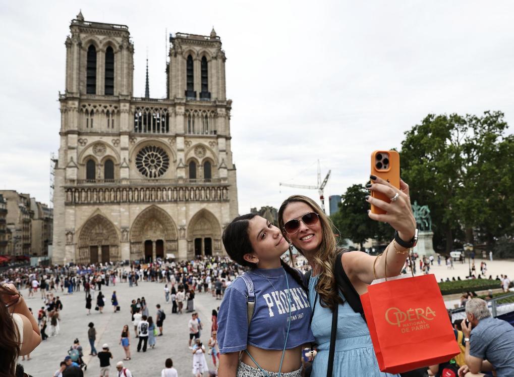 7月5日,两名女子在法国巴黎圣母院前自拍。新华社记者高静摄