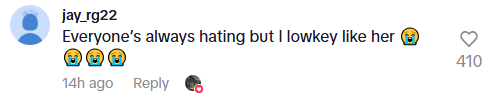 有一条支持她的评论得到了不少赞:“所有人都讨厌她,我只能低调地喜欢她,哭了.jpg。”