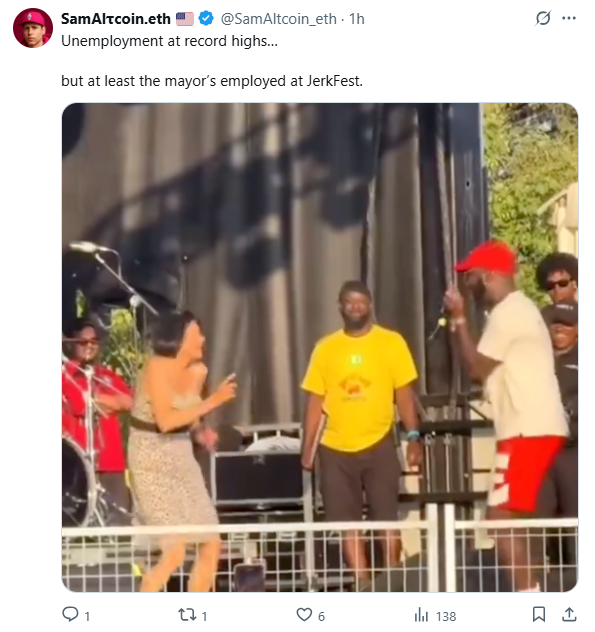 “失业率已经新高了,但是市长还能在JerkFest上就业。”