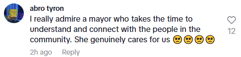 “我非常钦佩一位愿意花时间了解社区居民、与他们建立联系的市长。她真心实意地关心我们。”