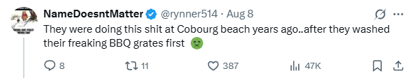 “多年前他们就在Cobourg沙滩干过这种事……而且还是先清洗完他们该死的烧烤架之后。”
