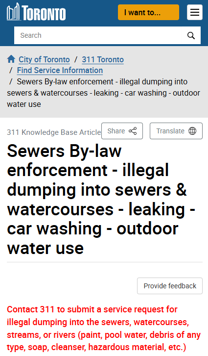 多伦多条例明确写道,如果发现类似情况,请拨打311提交服务请求,举报非法向下水道、水道、小溪或河流倾倒废弃物(如油漆、泳池水、各种碎片、肥皂、清洁剂、有害物质等)。