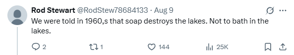 “早在上世纪60年代,我们就被告知肥皂会破坏湖水。不要在湖里洗澡。”