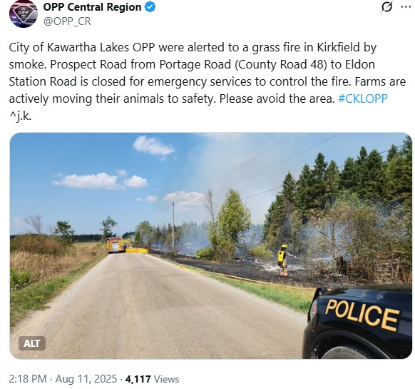周一下午,该地区的安省省警还接到了在柯克菲尔德镇(Kirkfield)发生的草地火灾的警报,该镇位于布恩特河西南约30公里处。