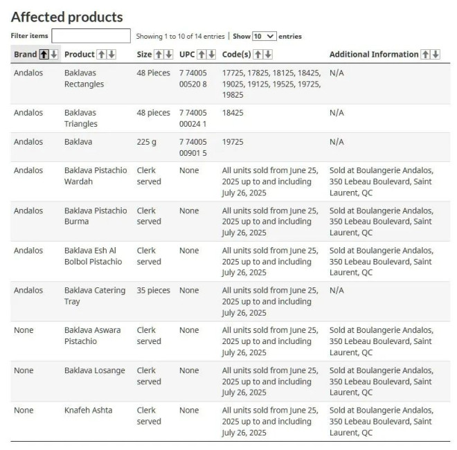 1. 加拿大食品检验局已对部分含有开心果的 Andalos 品牌果仁蜜饼发出召回通知,这些产品在新不伦瑞克省、安省、魁北克省分销,并在网上销售。