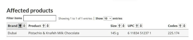 到目前为止,已经召回了蒙特利尔一家面包店出售的含有开心果的果仁蜜饼,以及在加拿大各地网上销售的带有开心果奶油和松脆克纳夫糕点的迪拜巧克力。