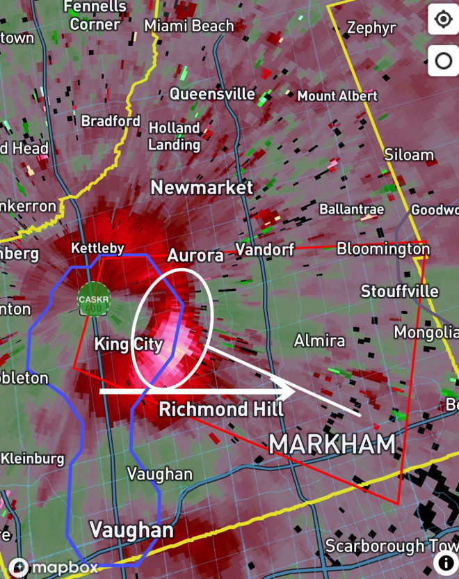 这场强雷暴位于King City附近,正以每小时20公里的速度向东移动。