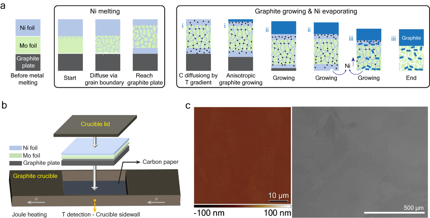 石墨因优异的电导率和热导率,被广泛用于电池负极、电磁屏蔽、催化和核技术等领域。但长期以来,传统高温处理聚合物薄膜或制备高取向热解石墨的方法,得到的材料晶粒较小、密度不足、表面易起皱。这些缺陷制约了石墨在高端应用中的潜力。