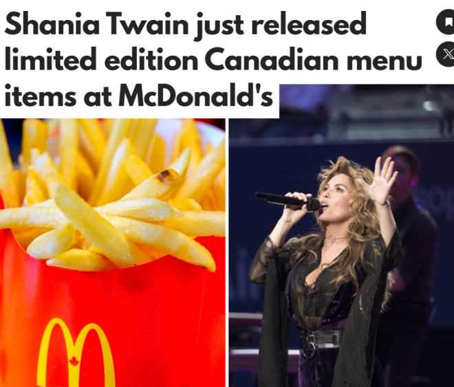 Shania Twain在新闻稿中表示,这次与麦当劳的合作对她而言意义非凡,既是味觉的盛宴,更是她人生的“圆满时刻”。多年前,她曾在多伦多的麦当劳做过员工。她坦言:“这次合作像一次回家。我当年就在麦当劳爱上了薯条,能用我的方式给它们‘打扮’,真的太神奇了!”