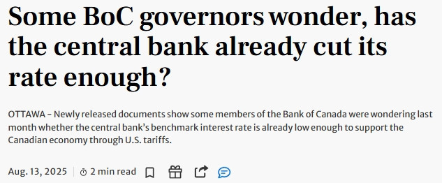 讨论纪要显示,一些成员认为,加拿大央行或许已经为经济在关税过渡期内提供了“足够的支持”。