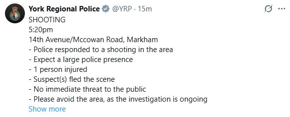 万锦14街McCowan枪击,现场大量警员,请绕行! 发布: 2025-08-15 据约克区警局通报,周四下午5时20分,14街和McCowan附近发生一起事件。 枪击导致一人受伤,嫌疑人已逃离现场。 警方表示,现场有大量警员,请公众绕行。 免责声明:本文仅代表作者个人观点,与华侨网无关联。其原创性及文中陈诉内容未经本网证实,对本文内容、文字的完整、真实性,以及时效性本网部作任何承诺,请读者自行核实相关内容。如发现稿件侵权,或作者无意愿在华侨网发布文章,请版权拥有者通知华侨网处理。