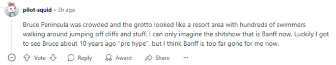 如今,不仅是国家公园,就连一些小的景点也遭殃,比如安省的布鲁斯半岛,附近的花瓶岛曾非常受欢迎。有网友表示:“布鲁斯半岛已被挤爆,洞穴里看起来就像个度假酒店,数百名游泳者四处游荡,跳崖之类的。我可以想象班夫有多糟糕。”