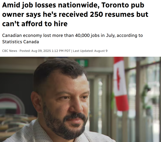 根据加拿大统计局上周五数据显示,7月就业岗位减少超4万个,失业率依旧高企在6.9%。