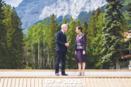 總理卡尼(左)今年6月在阿省斯迎接來參加G7峰會的墨西哥總統欣鮑姆(右)。(資料圖片)