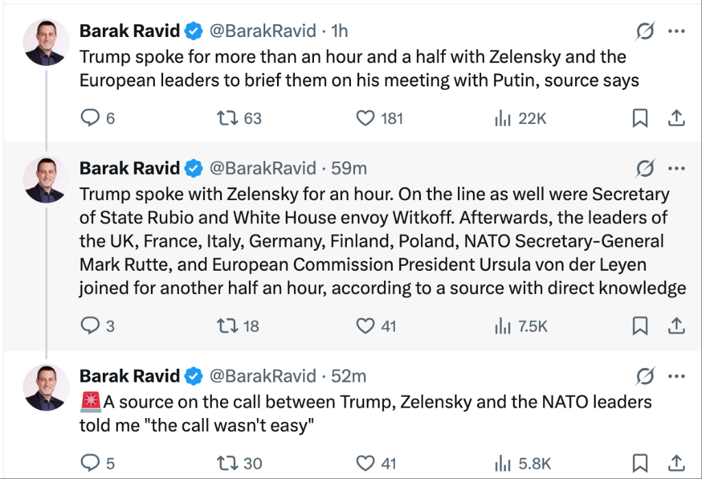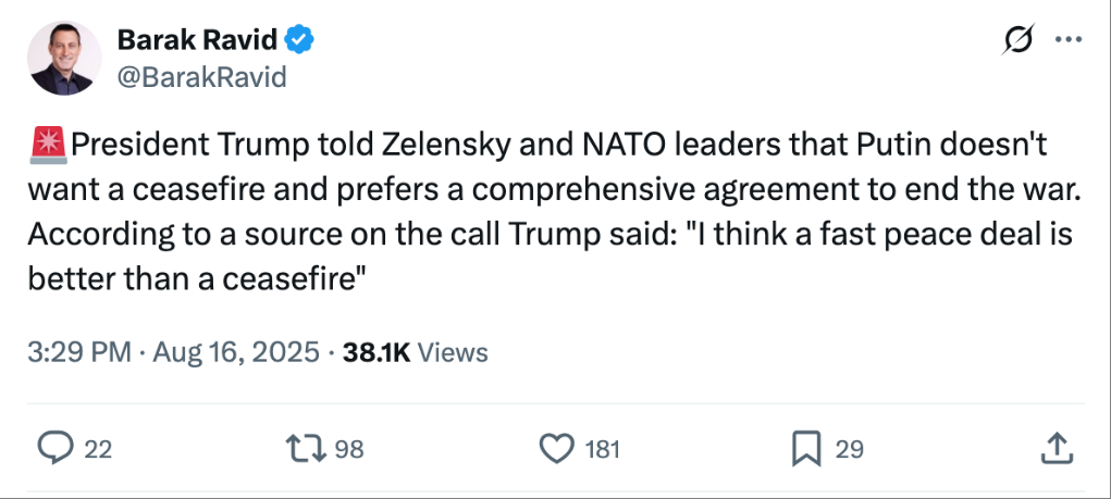 拉维德在一系列推文中还援引消息人士的话透露,特朗普告诉泽连斯基和北约领导人,“普京不想要停火,而倾向于一项全面协议,从而结束战争”。这名消息人士引述特朗普通话时的原话说:“快速(达成)的和平协议比停火好。”