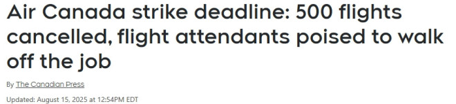 此前,(Air Canada)警告说,由于预计即将停工,公司已取消了原定于周五天起飞的约500趟航班,周六上午将全面停运。