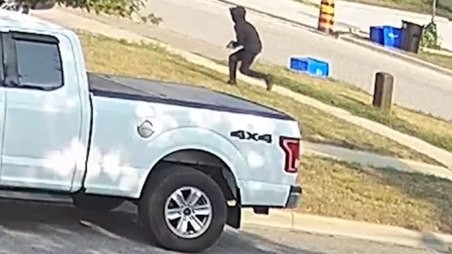 约克区警方公布了一段监控视频,视频显示周四在万锦市一个社区一名嫌疑人悄悄靠近一名男子并向他开枪,当时男子坐在自家车道上的SUV里。