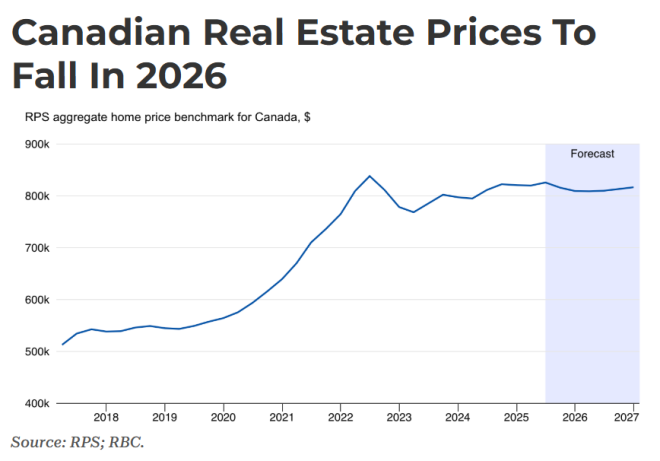 预计未来两年加拿大房地产价格将持平。加拿大皇家银行预测,2025年典型住宅的价格将上涨0.7%,然后在2026年下跌0.7%,这将使房屋价值跌至2023年以来的最低点。