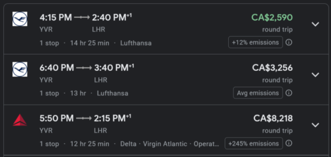 以温哥华往返伦敦为例,假如8月16日出发,8月22日返回,不同航空公司的机票价格差距很大。