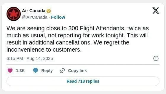 根据加航发布的最新消息,昨天8月14日, 34个航班取消,7,946名乘客受影响。