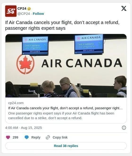 随着加拿大航空(Air Canada)因本周末约一万名空乘人员计划罢工而提前取消部分航班,一位航空乘客权益专家提醒广大乘客:如果你的航班被取消,不要轻易接受退款。