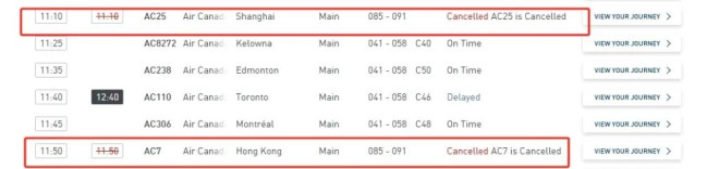目前,从温哥华出发的飞往迈阿密、丹佛、上海、香港、首尔、法兰克福和大阪等定期国际航班均已停飞。