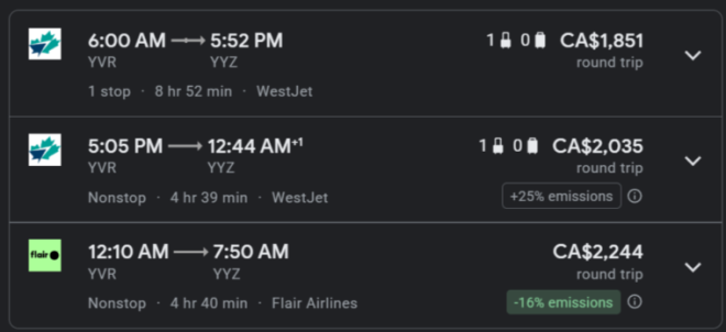 目前,加拿大国内航线票价因需求激增而持续上涨。以多伦多至温哥华为例,8月15日出发、8月22日返程的往返机票,Flair航空的最低价格已飙升至约1300加元,而相同路线在9月初的票价仅为273加元。