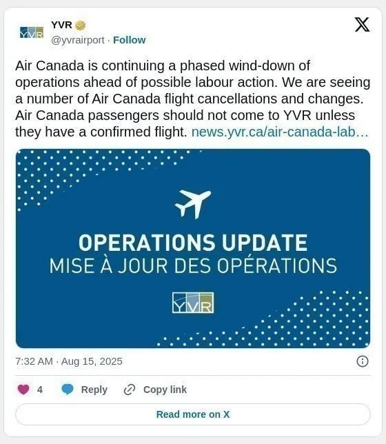 (加西网综合)由于加拿大航空与空乘工会尚未达成新协议,温哥华国际机场今天周五继续大量取消航班。