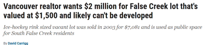 South False Creek,一块评估价仅$1,500元、性质为公共开放空间的空地,如今却可以被挂牌$200万出售。