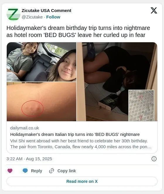本应是梦想中的欧洲生日之旅,却因疑似床虱变成一场噩梦——来自加拿大多伦多的游客石姓(shiVivi Shi)称,她在意大利威尼斯一间酒店内被床虱严重咬伤,整趟行程以崩溃收场。