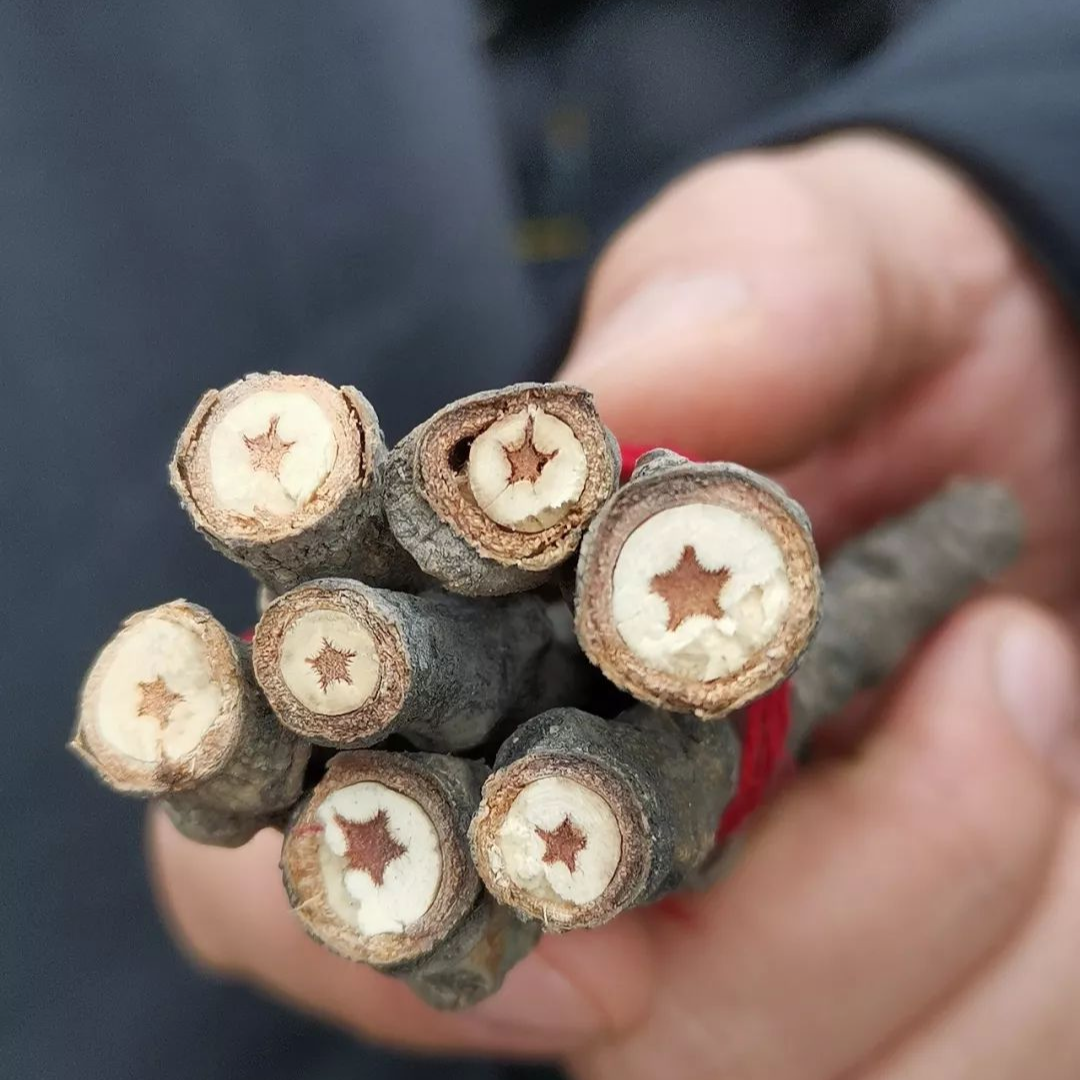 1940年清明节前后,八路军总部发动万余军民开展植树运动,朱德总司令和总部机关将士一道参加。奇特的是,沿着树枝的横纹轻轻掰开,在树枝的断面就会出现一个非常清晰的“五星”图案,端端正正,就像红军的五星帽徽一样,人们亲切地称之为“红星杨”。