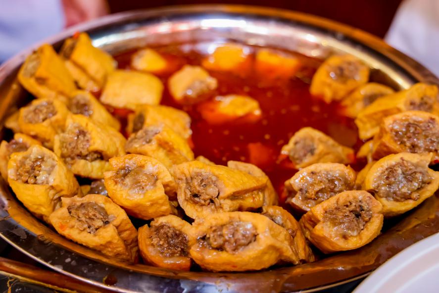 金包银的出场令人眼前一亮。金黄的外皮吸饱了卤汁,里面裹着紧实的肉馅,切开后层次分明。夹起一块送入口中,外层豆腐皮软韧中带着弹性,浓郁卤香迅速弥漫开来,随后是肉馅的鲜美与汁水在口中回荡。大家都觉得,这道小吃既厚重又精致,“一口咸香入味,豆香与肉香交织”,是最具代表性的沙县风味之一。