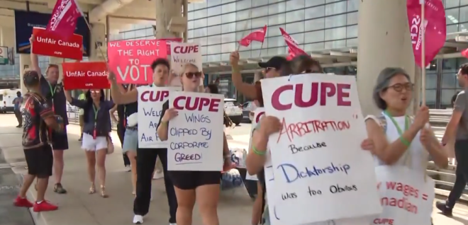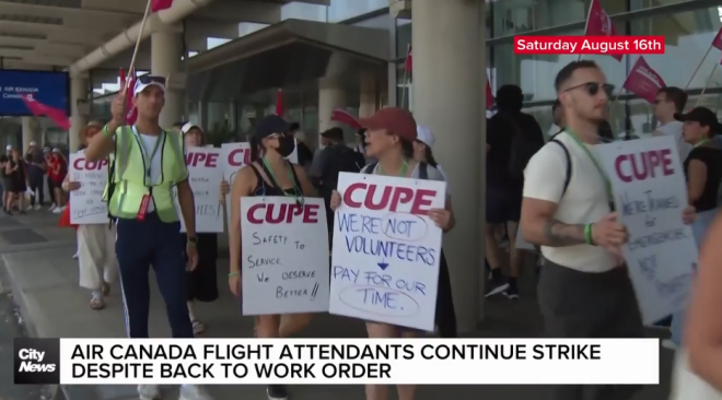 由加拿大公共雇员工会(CUPE)代表的这家总部位于蒙特利尔的航空公司的空乘人员,预计今天将继续留在线,以抵制联邦复工令。