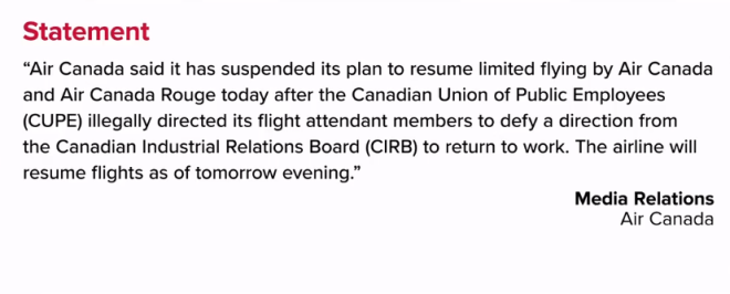 CUPE表示,它已于周日向联邦法院提出挑战,加拿大工业关系委员会此前下令要求10,000多名空乘人员从当天东部时间下午2点起必须复工。