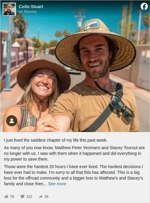 一位越野创作者、运营Dirt Theory频道的科林·斯图尔特表示,事发时他与这对情侣在一起,目睹了这场悲剧的发生。