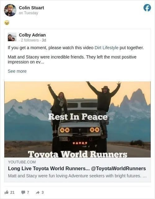 他们于7月31日上传了最后一部YouTube视频,距离去世仅一周时间。在这段近一小时的视频中,两人记录了在温哥华岛的越野之旅。
