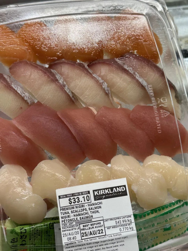一盒20片的鱼生寿司拼盘,价格约33加元($42.99/kg)。