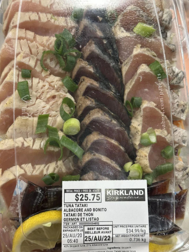 一盒24片的金枪鱼、黄鳍金枪鱼和鲣鱼Tataki拼盘,价格约25加元