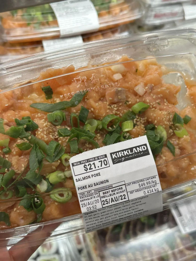 一盒三文鱼沙拉碗(poke),价格约21加元($49.99/kg)。