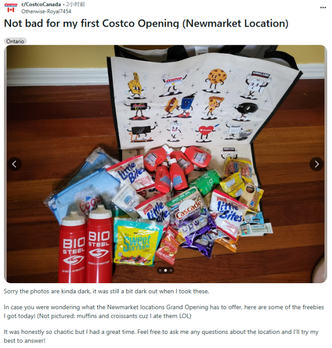 根据网友晒出的图片,免费赠品包括:Costco购物袋、Corona开瓶器、BioSteel水瓶、洗碗机洗涤剂、糖果、巧克力、饼干等等。