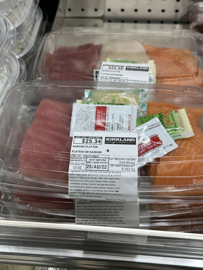 一盒24片的刺身拼盘,价格约25(具体价格取决于重量,$69.99/kg)。