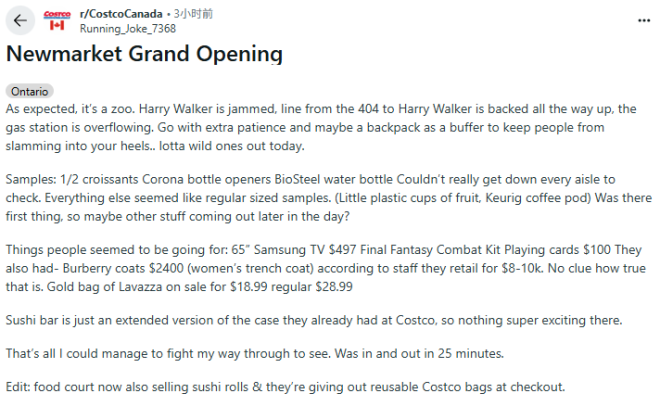 今天一大早,多伦多北面最新开业的Costco新市(Newmarket)门店人潮汹涌,开门前停车场已爆满,现场排起了长龙。