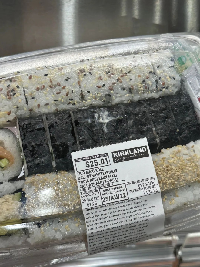 一盒24件三拼寿司卷,价格约25加元($22.99/kg)。