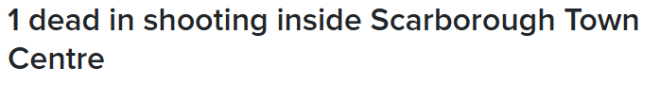 据较早前报道,多伦多警方在下午1点51前接到报警后,迅速赶到位于300Borough Drive的士嘉堡购物中心,发现一名男子身中枪伤,当场被宣布死亡。