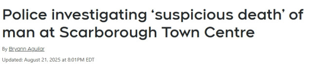 周四(8月21日)下午,购物中心(Scarborough Town Centre,STC)发生一起事件,一名男子当场死亡。
