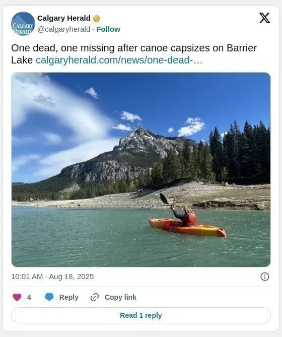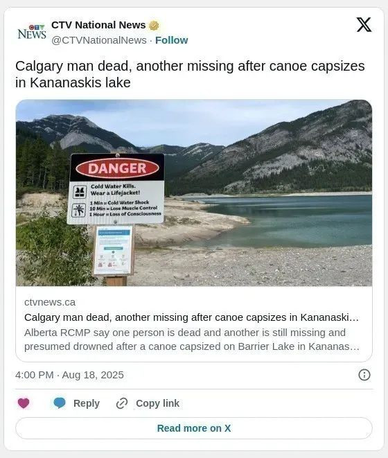 这样的事故,其实在加拿大并非个例。Kananaskis地区天气变化非常快,山里的湖泊几乎都由冰川融水补给,哪怕是夏天,湖水依旧冰冷刺骨。一旦翻船,哪怕会游泳的人,也可能因为低温和体力透支很快失去意识。如果没有穿救生衣,几乎等于把生还的希望大大降低。