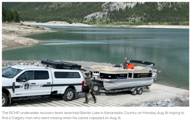 上周六(8月16日)傍晚,科克伦皇家骑警接到报警,赶往距离卡尔加里大约70公里的Barrier Lake。那里是很多人夏天喜欢去划船、露营的地方,但这一天,湖面因为天气突然变化,风浪特别大。一只载着三个人的独木舟翻了,随之而来的是一场噩梦。