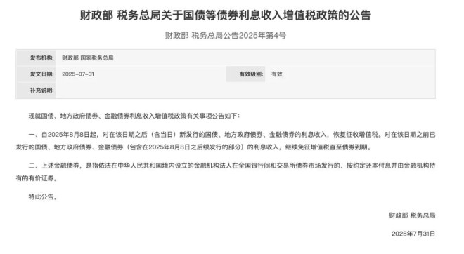 在财政部与国家税务总局联合发布的最新公告中明确,自2025年8月8日起,对当日及之后新发行的国债、地方政府债券及金融债券的利息收入恢复征收增值税上海市税务局。
